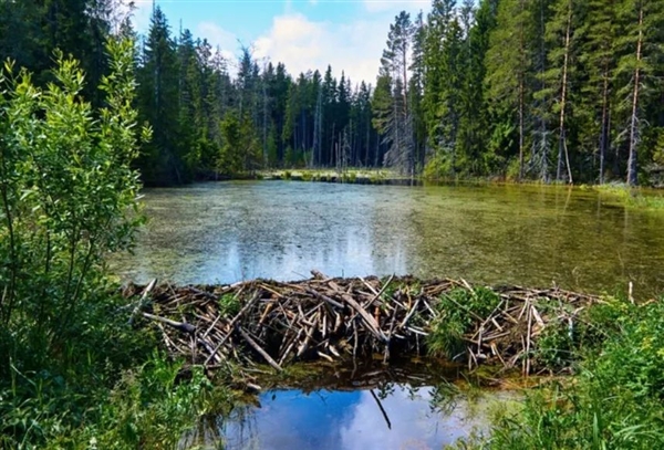 河狸属于啮齿类动物,是自然界出了名的“游泳健将”和“基建狂魔”,有着非凡的“筑坝”能力。为躲避熊等捕食者,河狸会用树枝、木头、石头和泥土“筑坝”,围成池塘或湿地,然后在坝上搭窝。