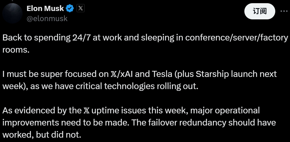 马斯克:回归全天候工作状态 将睡在工厂或服务器机房