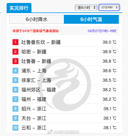 据中国气象爱好者6月27日讯  强对流来袭前,上海、苏南、浙北一带气温急速飙升,截至16时,上海和浙江共有8个国家站打破6月最高气温纪录,分别是: