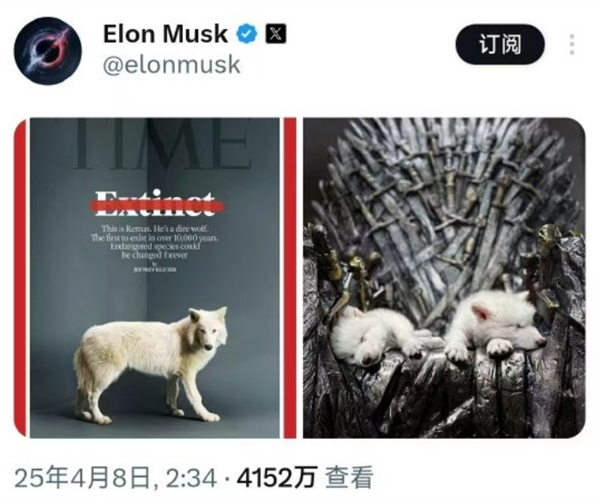 值得一提的是,马斯克同样对此事颇感兴趣,他于今日在X上转发了《时代》杂志的封面照片以及一张两只小白狼惠睡在类似《权力的游戏》“铁王座”上的照片,表达了对这一技术突破及其引发的伦理和生态问题的关注。 《权力的游戏》的作者乔治·R·R·马丁以已经绝种的恐狼为原型,创作出的冰原狼,按照小说中的人物艾德·史塔克的说法,冰原狼可以“像狗杀死老鼠一样轻易撕掉人的臂膀”。