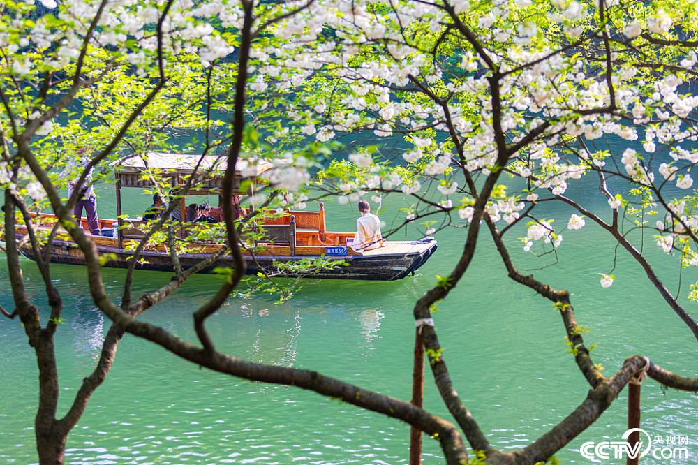 【晚樱映碧湖 游船入画来】据央视网4月8日讯 4月7日,杭州,西湖乌龟潭景区晚樱绽放,粉白花朵缀满枝头,与碧水、游船相映成趣。游人或泛舟赏樱,或花间留影,沉醉于这限定的春日浪漫,共赴一场花与湖的美好之约。