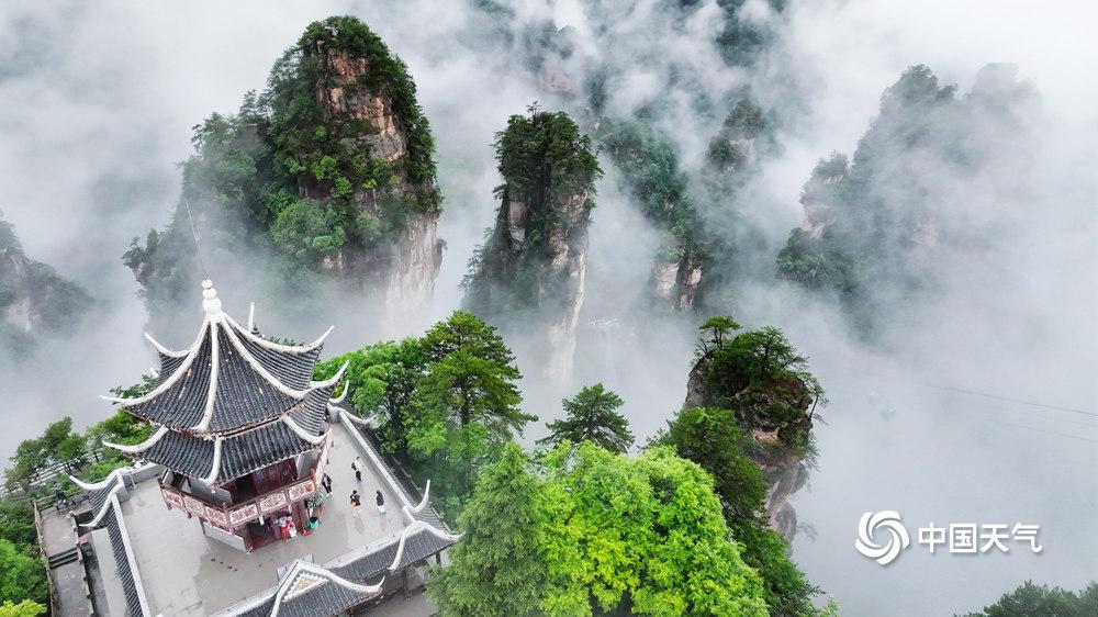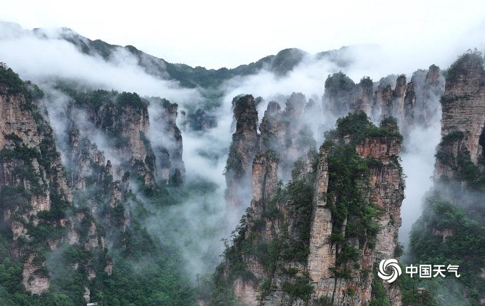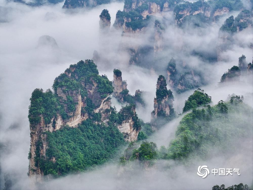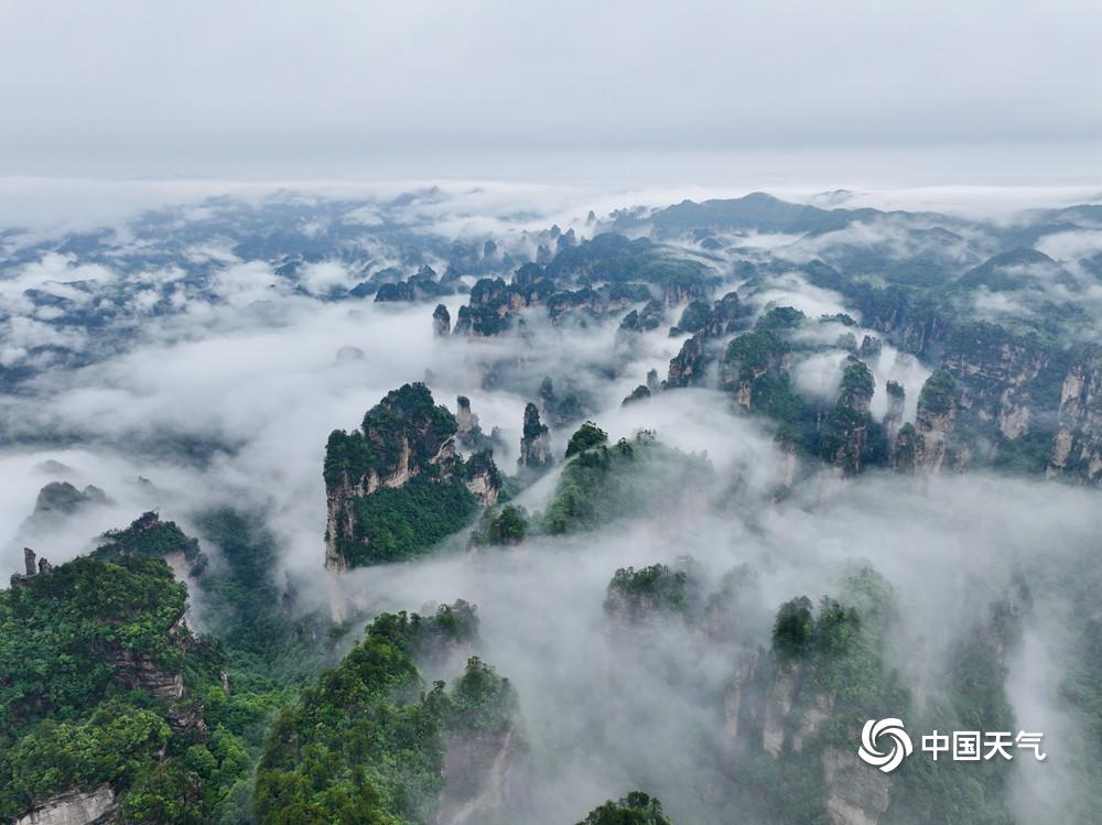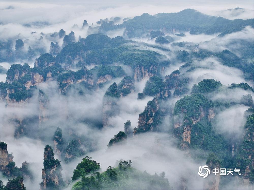 【云海翻涌 如泼墨画卷】据中国天气网5月24日讯 5月22日,强降雨过后的湖南张家界国家森林公园出现壮美的云海胜景。云雾在峰林间变幻飘逸,宛如水墨画卷。进入夏季以来,张家界国家森林公园频频出现云海景观,让人心旷神怡。