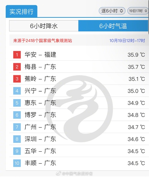据中国气象爱好者10月19日讯 今天,福建广东热浪滚滚,气温升至半个多月来最高点,福建华安35.9℃拿下全国最高,广东梅县蕉岭兴宁也达到高温线,深圳冲到34.6℃,打破中旬纪录。