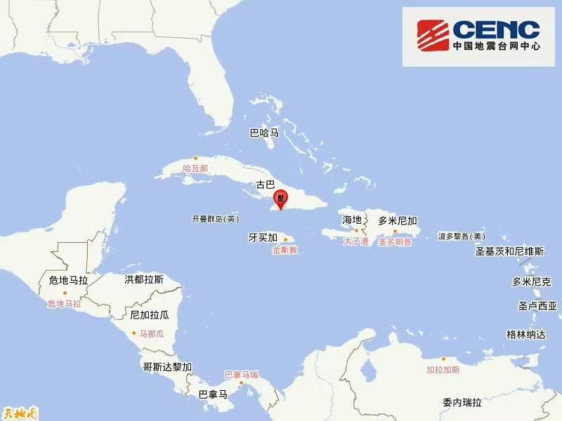 据中国地震台网正式测定 11月10日23时49分在古巴地区(北纬19.85度,西经76.95度)发生5.9级地震,震源深度10千米。