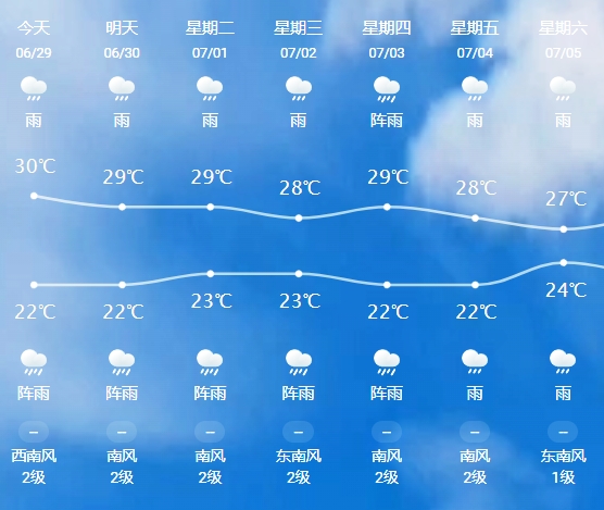 五、中国10天(6月28日12时~7月7日12时)天气:华北东北地区及四川盆地等地多降雨,江淮江南等地有大范围高温天气
