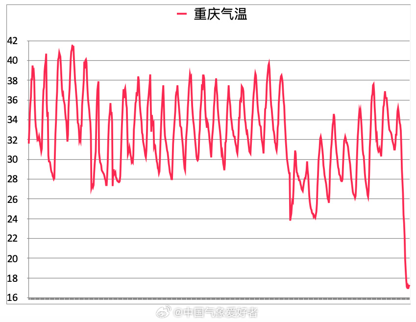 据中国气象爱好者9月30日讯 重庆沙坪坝国家站气温曲线,在9月30日这天被冷空气搞崩盘了,直接从盛夏跳入秋天。重庆沙坪坝9月平均气温32℃,打破全国纪录。