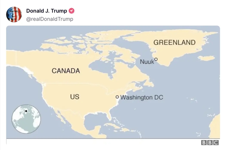 1月7日早些时候,特朗普在其社交平台发布“加拿大被纳入美国”之后的“美国全新版图”。