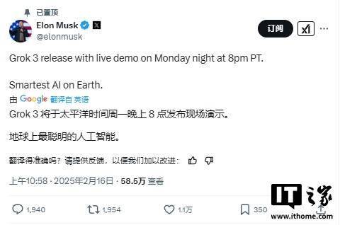 据IT之家2月16日消息 马斯克在社交平台X上表示,Grok3大模型将于太平洋时间周一晚上8点(IT之家注:北京时间2月18日12点)发布,届时将进行现场演示,马斯克称其为地球上最聪明的人工智能。
