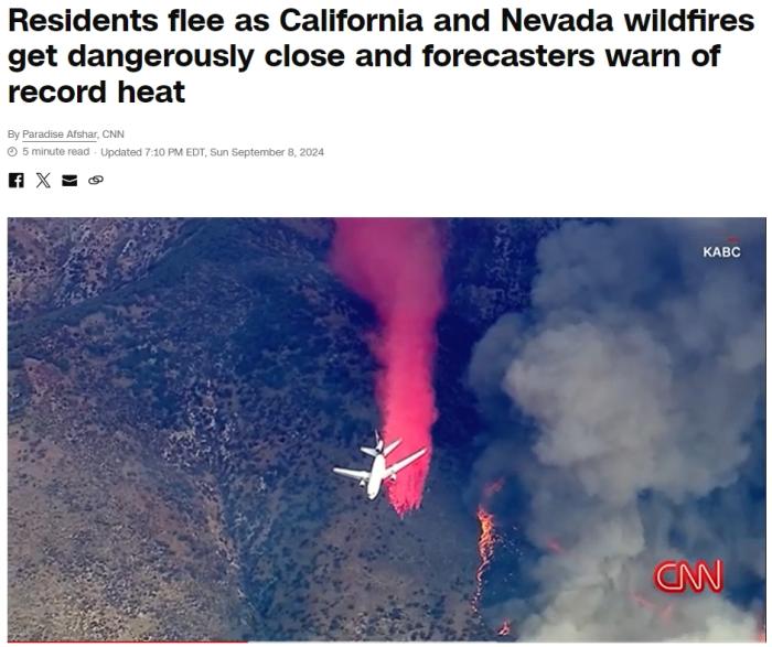据华人头条9月9日讯 据美国有线电视新闻网(CNN)8日报道,连日来,美国加利福尼亚州和内华达州的野火肆虐,截至当地时间8日,大火已烧毁近1.8万英亩土地,加州近5000户家庭紧急撤离。 据报道,这场野火从当地时间5日开始燃烧。据加州消防部门称,约500名消防员正在参与野火扑救工作,但截至当地时间8日早上,火势控制率仍为0%。 随着火势逼近,加州圣贝纳迪诺县警局宣布强制撤离当地近4800户家庭。加州消防部门表示,目前有超3.5万栋建筑受到威胁,包括单户住宅和多户住宅、商业建筑和其他小型建筑。 加州消防部称,雷暴风导致火势“非常不稳定”,植被“极度干燥”,预计未来几天炎热干燥的天气和雷暴将给消防员带来挑战。 原文链接:https://www.52hrtt.com/ar/n/w/info/F1725331761562 秘鲁今年以来已发生超2500起森林火灾 财联社9月9日电 秘鲁环境部官员当地时间9月9日表示,该国今年以来已经发生了超过2500起森林火灾。据介绍,火灾频发的原因包括降水量少、高温、干燥等,其中约98%的火灾与人类活动有关。 原文链接:https://www.cls.cn/detail/1793816