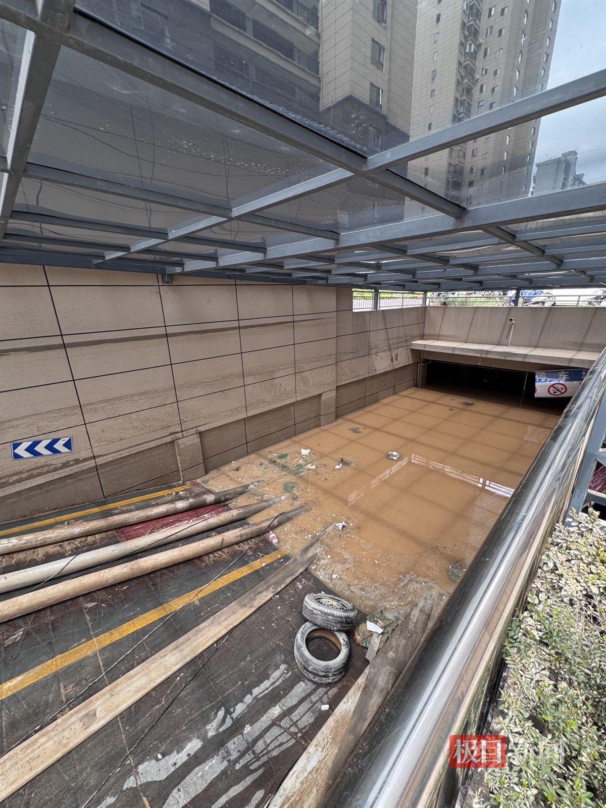 六和人家小区地下停车库仍有较深积水,截至26日11时车库积水还有两米多高。