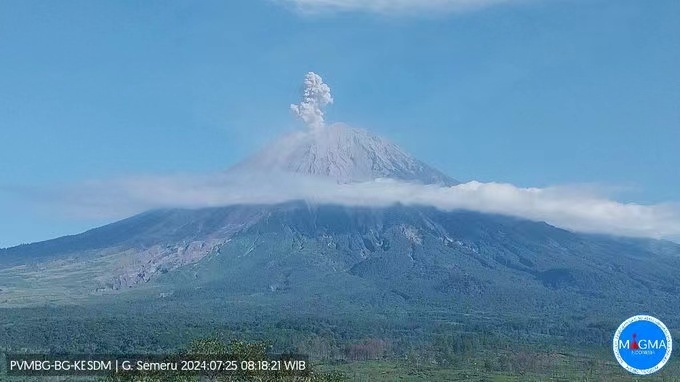 据华人头条7月25日讯 据印尼火山与地质灾害研究机构(PVMBG)消息,当地时间7月25日8时17分,印尼塞梅鲁火山发生喷发,火山灰柱高度达900米,喷发持续时间为107秒。
