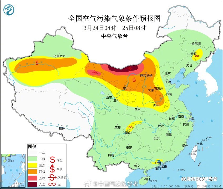 据中国气象爱好者3月24日讯 旧沙未平,新沙又起。昨天,影响黄土高原的沙尘已经随风吹到河南、山东、山西,部分沙尘还从山东飘入黄海,郑州、开封、洛阳、菏泽、临汾12点空气质量指数全部爆表。