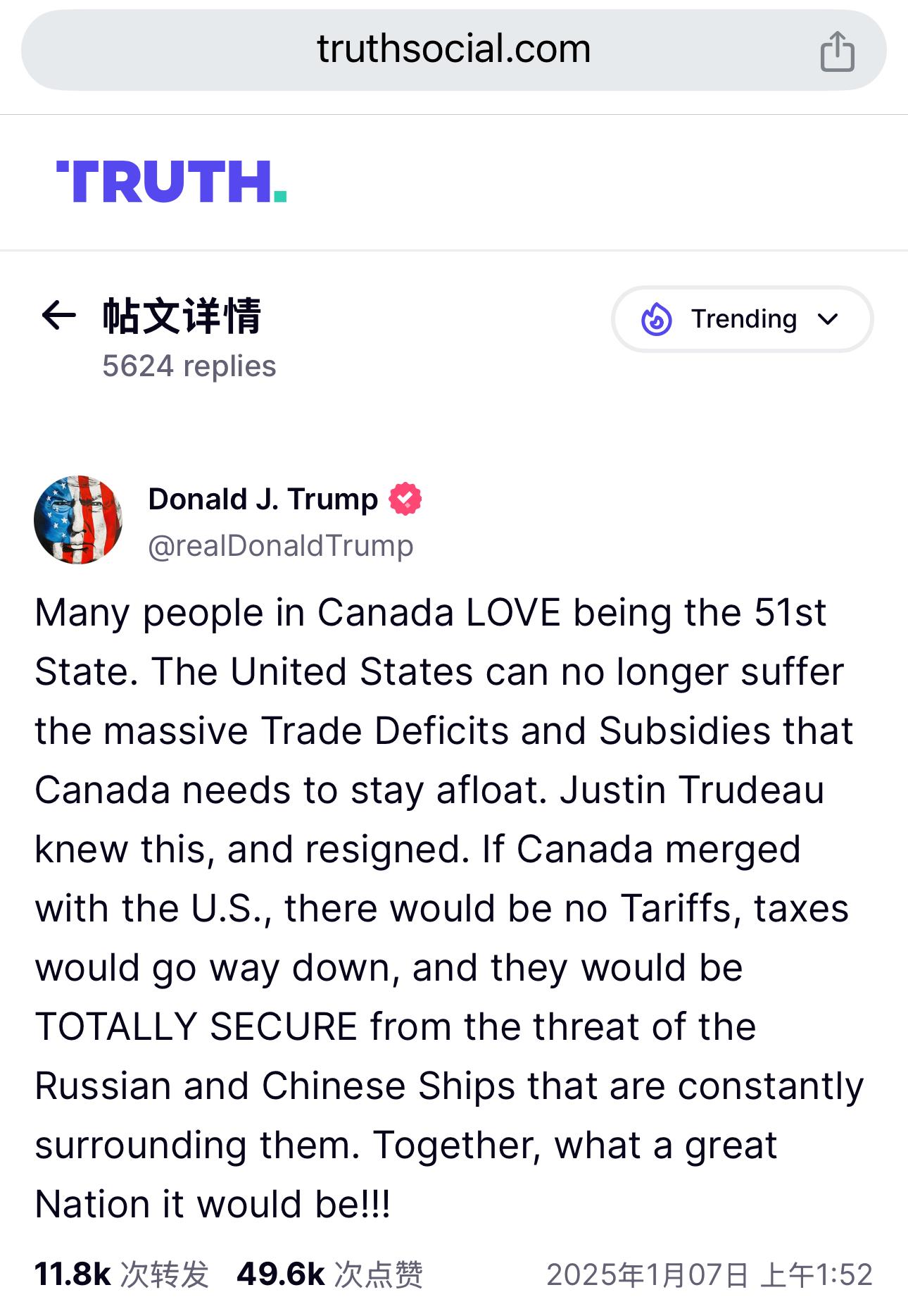 财联社1月7日电 在加拿大总理贾斯汀·特鲁多宣布辞职后,美国当选总统特朗普再次提出美国和加拿大“合并”的想法,并指出如果加拿大加入美国,将不会被征收关税。 “许多加拿大人喜欢成为美国第51个州。美国无法再忍受加拿大维持生存所需要的巨额贸易逆差和补贴。贾斯汀·特鲁多知道这一点,于是辞职了。” 特朗普在他自己的社交媒体平台Truth Social上写道。“如果加拿大与美国合并,就不会有关税,税收会大幅下降,他们将完全安全,免受俄罗斯船只不断包围他们的威胁。团结起来,这将是一个多么伟大的国家!!!”特朗普称。 原文链接:https://www.cls.cn/detail/1910601