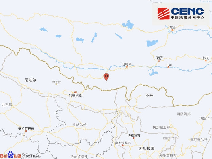 另中国地震台网正式测定 1月7日9时5分,在西藏日喀则市定日县(北纬28.50度,东经87.45度)发生6.8级地震,震源深度10千米。从地图上可看出,震中离珠峰不远。