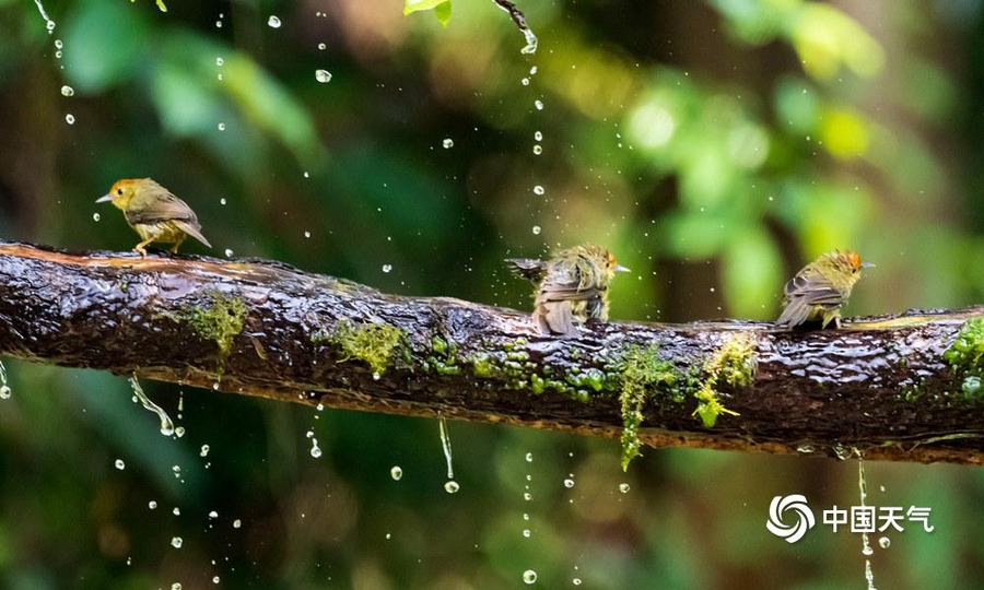 8月30日,广西南宁天气闷热难耐,在良凤江国家森林公园,不同种类的几只小鸟来到一处人工水槽清理羽毛、消暑降温。(中国天气网)