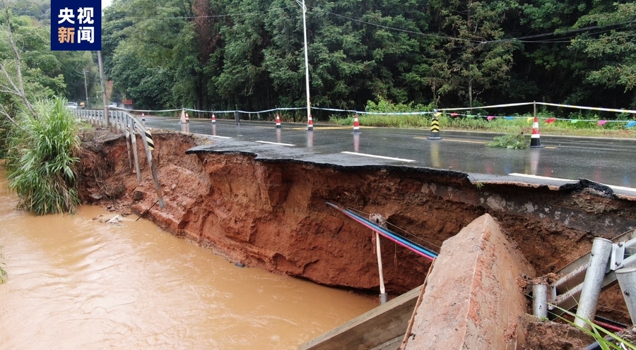 台风“格美”来袭 江西定南县一处省道路基发生50米长坍塌
