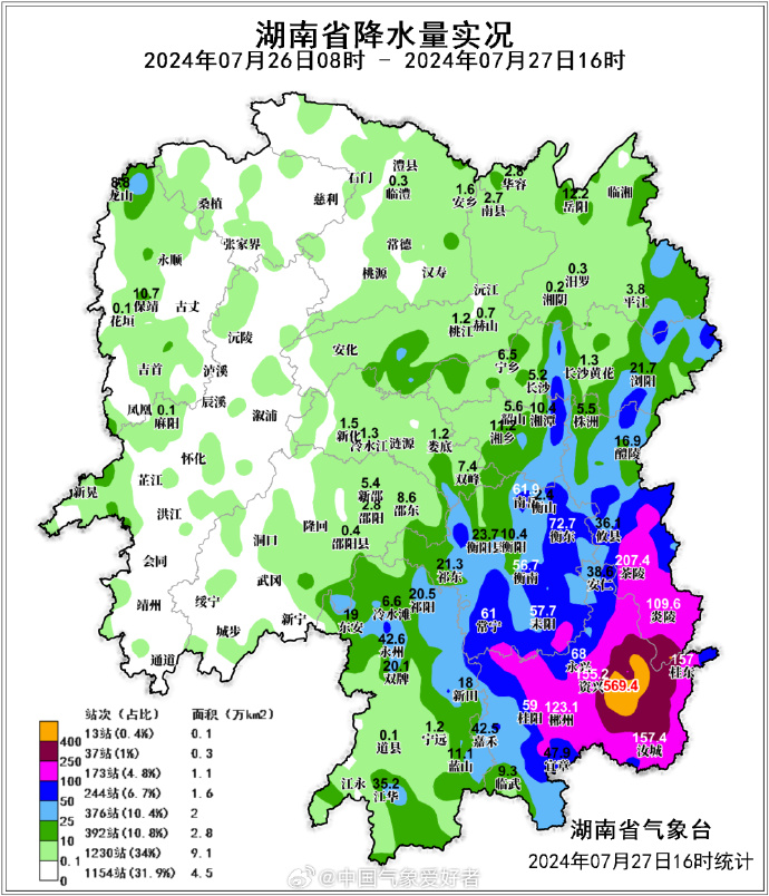 资兴坪石自动站24小时降雨量达到600毫米,12小时降雨量481.9毫米,两项数据均打破全省纪录,这是湖南首次出现24小时600毫米以上的极端暴雨。