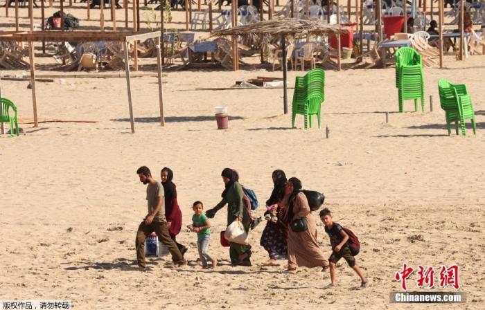 图为当地时间9月23日,黎巴嫩提尔,人们在海滩上携带财物逃离。
