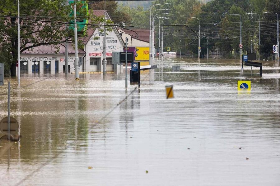 9月16日,捷克城市俄斯特拉发的街道被洪水淹没。(法新社)