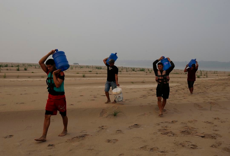 9月8日,人们在巴西亚马孙地区马代拉河干涸的河床上搬运饮用水。(美联社)