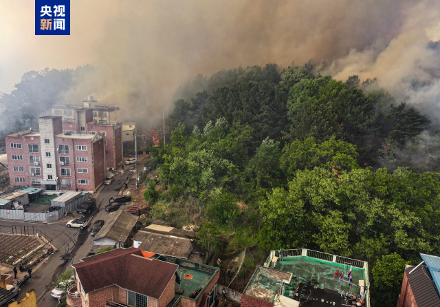 韩国大邱市山林火灾持续燃烧 上千人被疏散