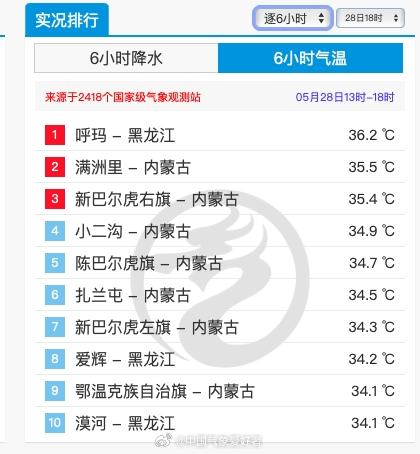 据快科技5月28日消息 黑龙江呼玛、爱辉,内蒙古新巴尔虎右旗、海拉尔、满洲里,这些冬天低温榜常客如今成为了全国最热的地方。 就在今天,黑龙江呼玛成为了全国最热的地方,此前呼玛冬天的最低气温能达到-48.2℃,相比之下,南方正在经历一轮降雨,江南一带气温普遍20℃出头,和北方形成强烈反差。 原文链接:https://news.mydrivers.com/1/1050/1050529.htm 另据中国气象爱好者5月28日讯 今天,中国东北越往北气温越高,黑龙江畔的呼玛国家站气温飙升到36.2摄氏度,直接打平了当地5月最高纪录,内蒙古呼伦贝尔满洲里、新巴尔虎右旗也冲上35摄氏度高温线,全国高温排行榜前十非常少见地被东北全部拿下。 明天,东北气温还将继续攀升,南边平原的气温也要上来了,沈阳、长春、哈尔滨将携手冲上30摄氏度。 原文链接:https://weibo.com/1763864272/PtWfNF1Q9